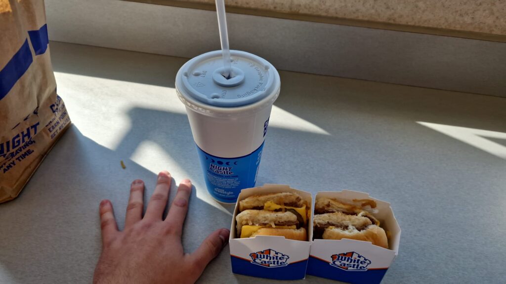 Hand is visible for scale. Burgers there are named “Slides” because of their size. The main advantage about Whitecastle is their very low prep time and their low prices… and that’s all.